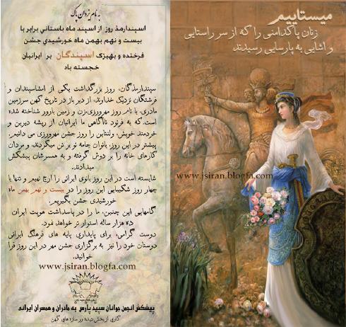 جشن اسپندگان يا سپندارمذگان :جشن بزرگداشت جايگاه زن و زمین _ بيست و نهم بهمن ماه( بر بنیان گاهشمار خورشیدی) پنجم ام اسپند ماه ( بر بنیان گاهشمار باستانی) _ اسپندگان جشن بزرگداشت يکی از امشاسپندان و فرشتگان نزديک خداوند و همچنين بزرگداشت و پاس داشت جايگاه والای زمین بارور(که همچو مادری مهربان برای مردمان می باشد) زن،مادر و همسر ايرانی است، در اين روز به پاسداشت جايگاه والای زن در ايران همه ی کار های خانه بر دوش مردان و پسران خانه می باشد .